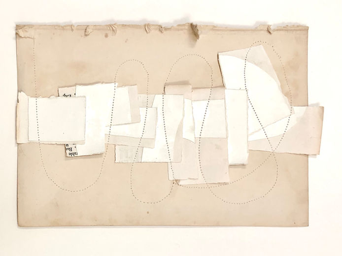 During the initial part of shelter-in-place due to the Covid-19 Pandemic, there was pressure to produce more, do more, create more relevant, important art. At first everything about the quarantine felt overwhelming, so I attempted to simplify my process and focus on documenting the time in ways that involved simple, detailed, repetitive tasks. I converted my dining room into a temporary studio and I restricted myself to materials I had on hand. As a result, I began constructing paper quilts from my antique paper collection; cutting and sewing rectangular shapes together with cotton thread on the sewing machine.